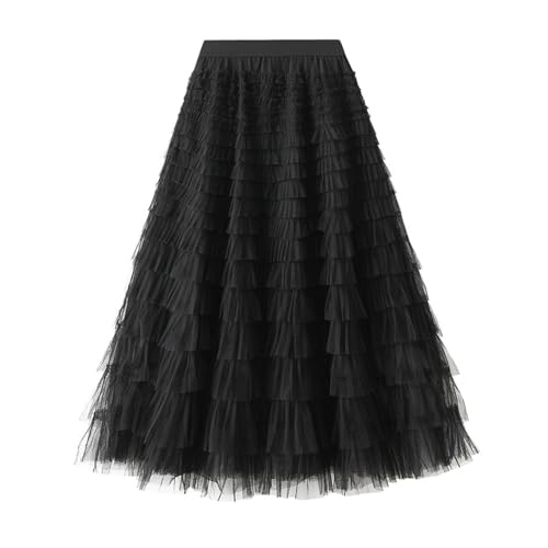 Jemsia Tyllkjol för kvinnor, midi, volanger, nivå, kakkjol, elegant, elastisk hög midja, A-linje, underkjol, nät, lång tutu, blommiga kjolar för bal, hemkomst, födelsedagsfest, Svart, en storlek
