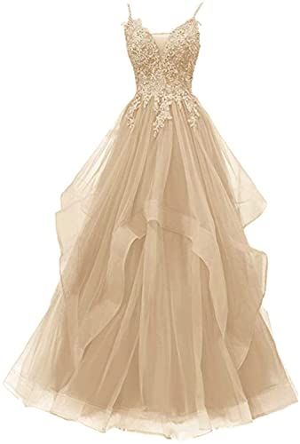 Xinaier Tyllklänning med spagettiremmar för damer, lång, formell aftonklänning, balklänning, brudklänning, anpassbar, champagne, 36
