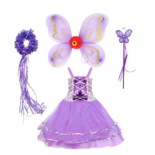 Tante Tina Fjäril älvdräkt flicka – 4-delad flickkostym med tyllklänning, vingar, trollstav och hårband – lila – lämplig för barn från 2 till 8 år