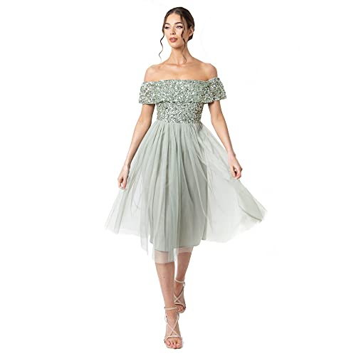 Maya Deluxe Aftonklänning med paljetter – cocktailklänning dam med V-ringning – tyllklänning dam med korta ärmar, Grön lilja, 54 SE