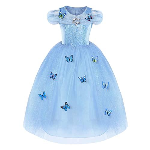 URAQT Askungen Klänning, Askungen Prinsessdräkt med Fjäril, Blå Dansklänning Prinsessklänning för Flickor, Fin Tyllklänning för Bröllop, Fest, Bal, 3-8 år Gammal 140cm