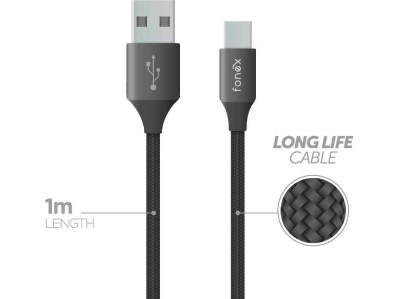Data Cable Usb To Type-C 12W Fabric 1M By Fonex Juodas