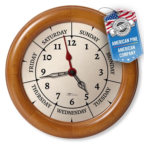 DayClocks Tid- och veckodag väggklocka med massiv träram – veckovis analog klocka med dagar, timmar och minuter – tyst väggmonterad klocka – idealisk pensionspresent för män och kvinnor, tallträ, 25,4