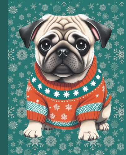 Cute Pug Christmas Composition Notebook: Adorable Christmas notebook featuring a pug wearing a ugly Christmas sweater | Wide-ruled paper for dog ... gift with snowflakes | 110 pages
