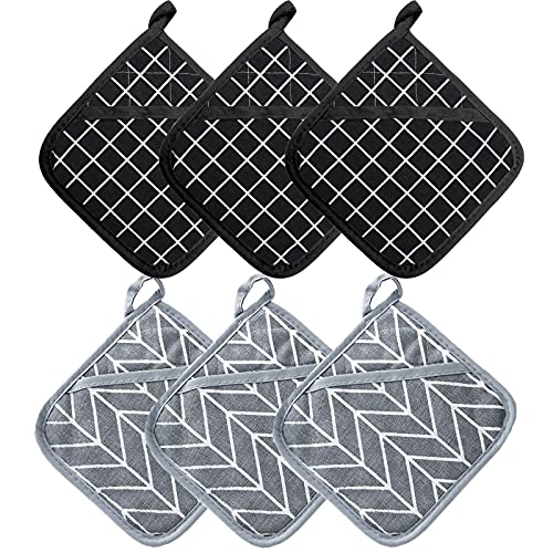DXRPO Ugnshandskar värmebeständiga och grytlappar set, tjocka grythandskar set av återvunnen bomull fyllda, grytlappar för matlagning, 18 cm x 18 cm, 3 stycken svarta med 3 stycken grå