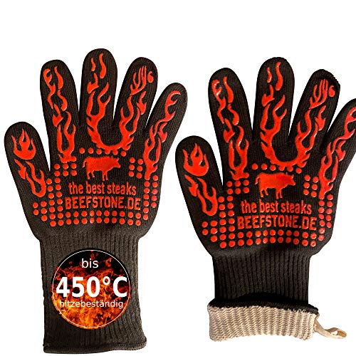 Brandsäkra handskar BBQ – grillhandskar av Beefstone – värmebeständiga upp till 450 °C, tvättbara ugnshandskar/kökshandskar/bakhandskar av silikon/deyan-fiber/bomull 34 cm, 1 par