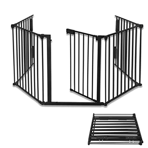 Froadp Kaminskyddsgaller i metall, ugnsskydd med dörr, 305 x 76 cm, lekhage, babylekhage, avspärrningsgaller, djurskyddsgaller inkl. 5 element, kaminggaller barnskydd, skyddsgaller (svart)