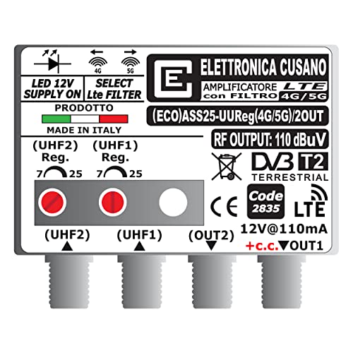 (ECO) ASS25-UUReg(4G/5G)/2OUT TV-antennförstärkare med LTE-filter 4G och 5G (valbar), mastantennförstärkare, 2 UHF-ingångar, Gain 25 dB, antennförstärkare 2 utgångar, tillverkad i Italien