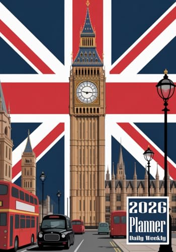 2026 Planner: London United Kingdom Red double-Recker Buses Union Jack UK Flag Themed Cover Design Daily Weekly Diary 12 Month Calendar Vision board Schedule Organizer Goals Dairy Notes