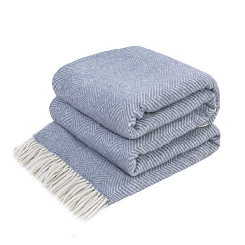 LYHome Merino ull Pläd - Filt med Fransar. Yllefilt Perfekt för Soffa, Säng, Vardagsrum, Sovrum, för Dekoration och Som Gåva. Varm, Mysig och Mjuk Pläd (140 cm x 200 cm/Blå med Vitt)