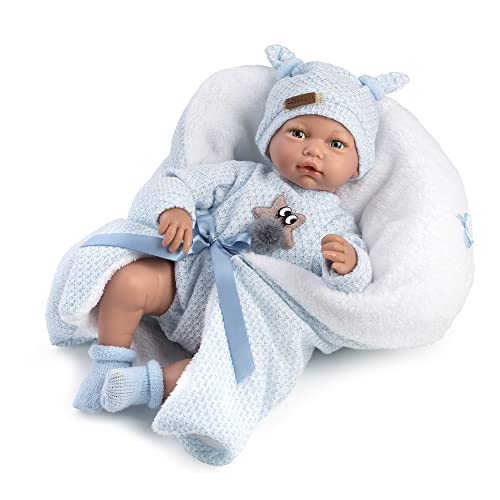Hugo doll, hårlös, sparkdräkt och mössa i blå ull och filt. Utan mekanism 38 cm