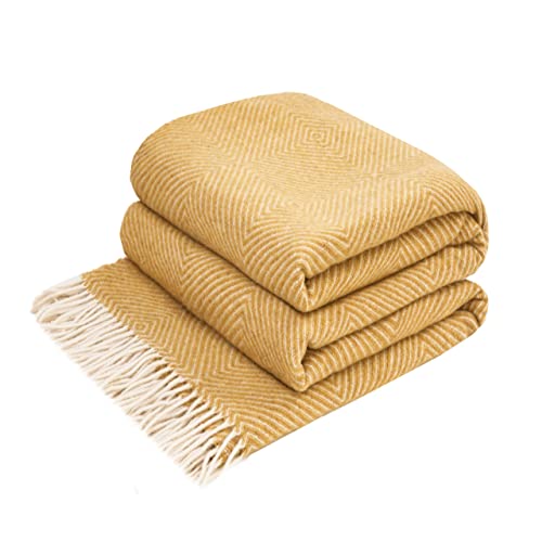 LYHome Merino ull Pläd - Filt med Fransar. Yllefilt Perfekt för Soffa, Säng, Vardagsrum, Sovrum, för Dekoration och Som Gåva. Varm, Mysig och Mjuk Pläd (140 cm x 200 cm/Senapsgult med Vitt)