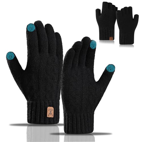 FOSDICK 2 par termiska handskar herr dam, mjuka fingerlösa handskar, taktila handskar, förtjockade vinterhandskar för män, ullhandskar för utomhussporter, promenader, klättring, arbete, svart