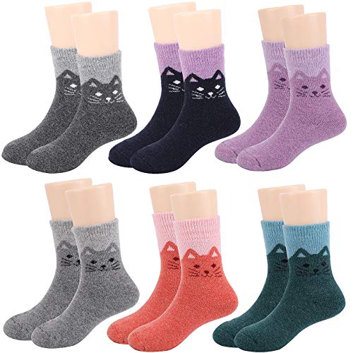 QKURT Vinterstrumpor för barn, 6 par ullstrumpor termostrumpor tjock bomull besättning nyhet söta kattstrumpor, för 1–12 år gamla flickor, Flerfärgad, Large