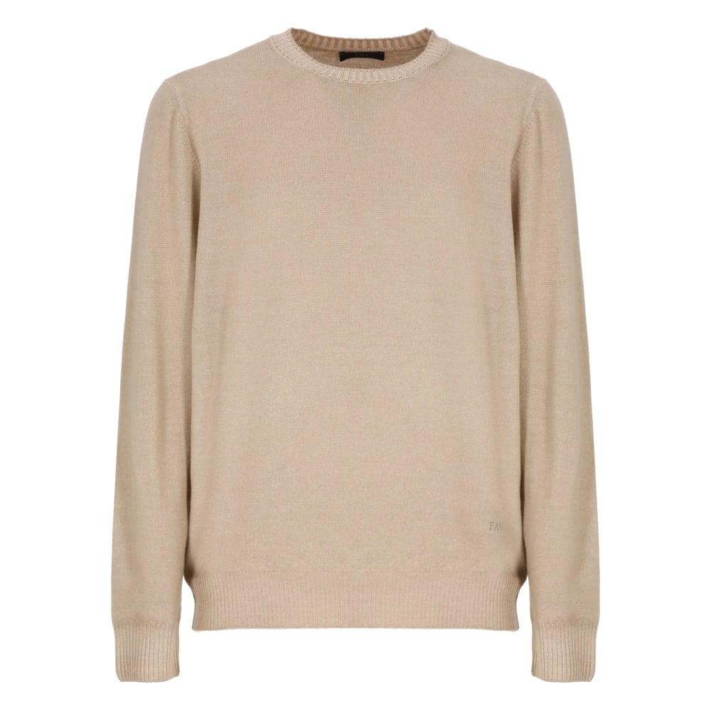Fay, Stickade Tröjor , Herr, S, Beige Ulltröja med Broderad Logotyp