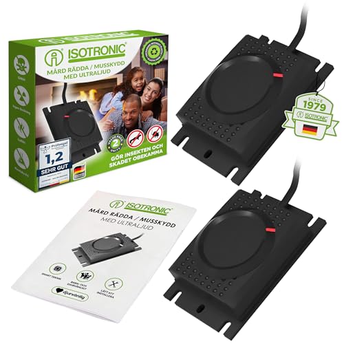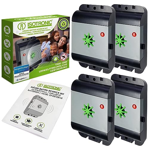 ISOTRONIC Musskrämma med ultraljud mot möss och råttor | batteridriven musskrämma för trädgård, hus, källare, vindar, garage och mycket mer. | djurskonsam och säker – 30 m² räckvidd