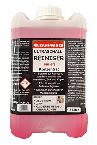 CleanPrince Ultraljudsrengöring 5 liter surt | ultraljud – rengöringsmedel koncentrat färgmetaller aluminium zink koppar myntrengöring ultraljud – delar tvättmaskiner oxiderade metallytor