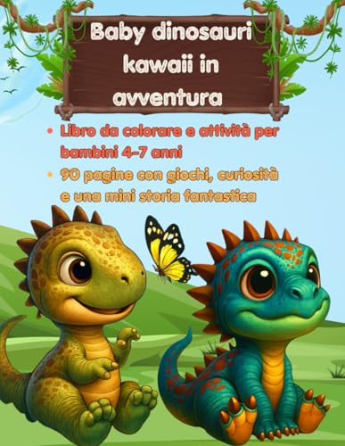 Baby dinosauri kawaii in avventura: "Libro da colorare e attività per bambini 4-7 anni – 90 pagine con giochi, curiosità e una mini storia fantastica"