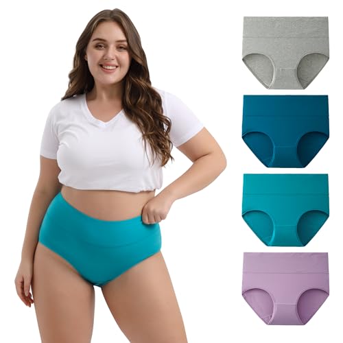 INNERSY Underbyxor, stora storlekar, dam, midjetrosa, bomull, hög midja, trosor (44–62), 4-pack, Blå/grå/grön/lila, 44-46