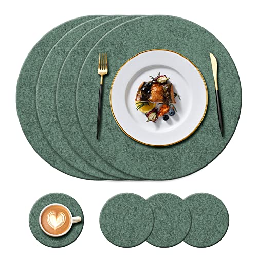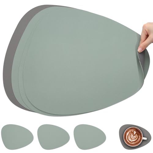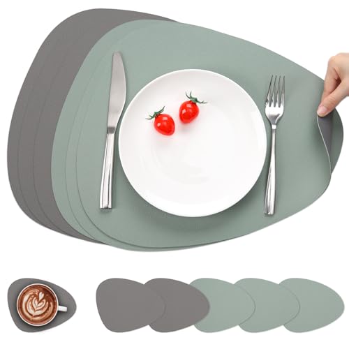 Myir JUN Läder bordsmattor och underlägg, underlägg rund PU vattentät dubbelsidig kök bordsunderlägg kaffe mattor halkfria tvättbara bordstabletter och underlägg set 4 (set med 4, grå salvia grön)