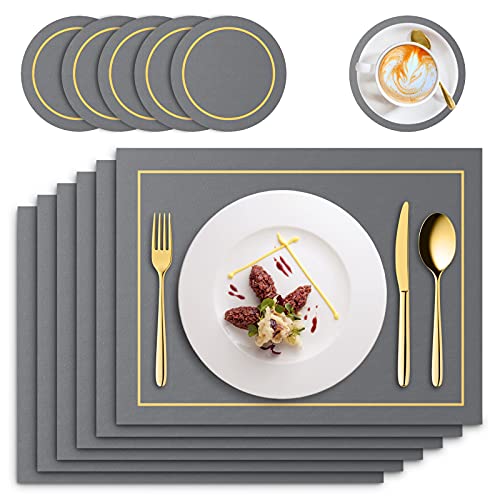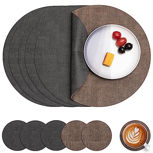 Myir JUN Läder bordstabletter och underlägg set med 6, bordsmattor runda vattentäta dubbelsidiga köksmattor kaffe mattor värmetåliga bordsunderlägg halkfria tvättbara (set med 6, grått kaffe)