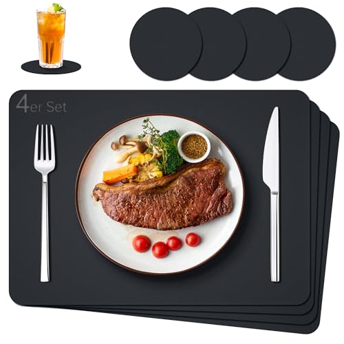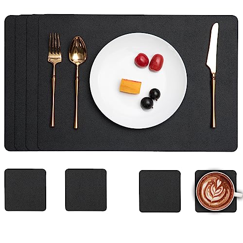 Myir JUN Läder bordsmattor och underlägg, dubbelsidiga läder bordstabletter och underlägg vattentäta bordstabletter uppsättning av 4 bordstabletter halkfria tvättbara bordsunderlägg (svart svart, set