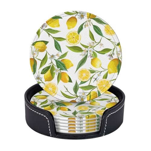 6 st färska tropiska citroner tryck läder runda underlägg med hållare för kaffebar köksbordsdekor