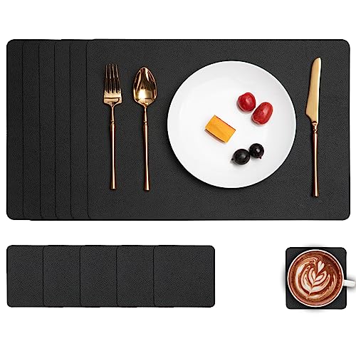 Myir JUN Läder bordsmattor och underlägg, dubbelsidiga läder bordstabletter och underlägg vattentäta bordstabletter uppsättning av 6 bordstabletter halkfria tvättbara bordsunderlägg (svart svart, set