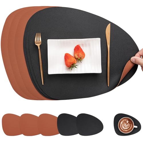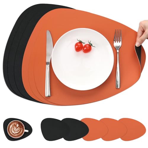 Myir JUN Läder bordsmattor och underlägg, underlägg rund PU vattentät dubbelsidig kök bordsunderlägg kaffe mattor halkfria tvättbara bordstabletter och underlägg set 6 (set med 6, svart orange)