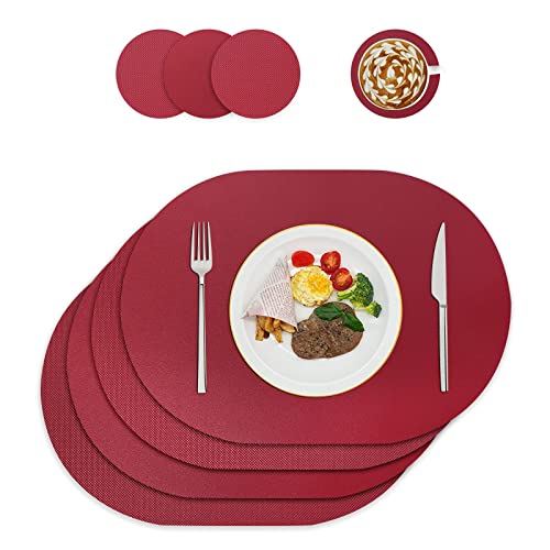 WAKOSAN Bordstabletter och underlägg av läder, tvättbara bordstabletter, bordsdekoration, bordsunderlägg, tvättbar rund, bordstabletter för kök matbord, set om 4 (oval, vinröd)