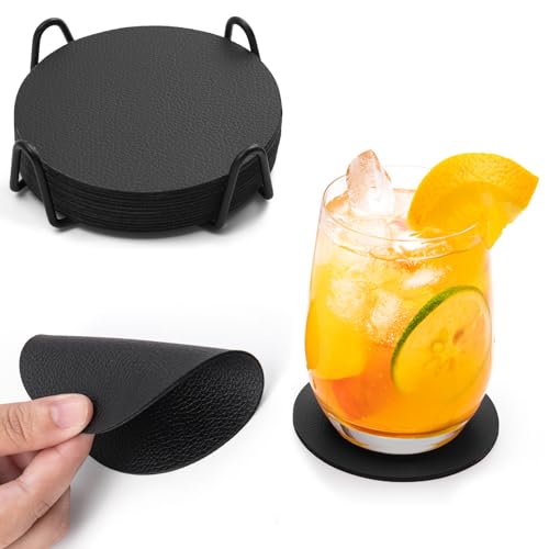 Chitomars Underlägg - Set Om 12 Dubbelsidiga Glasunderlägg, Dryckesunderlägg, Halkfritt Underlägg i Läder, Konstläder Med Läderutseende (Svart)