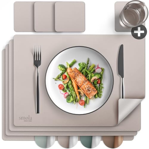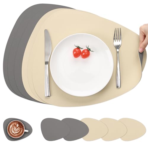 Myir JUN Läder bordstabletter och underlägg set med 4, bordsmattor runda vattentäta dubbelsidiga kökstabletter kaffe mattor värmetåliga bordsunderlägg halkfria tvättbara (set med 4, grå beige)