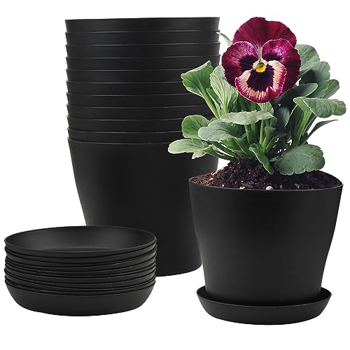 JIEHIN 12 stycken 17 cm blomkrukor plast svart, trädgårdsblomkrukor med underlägg och dräneringshål, små planteringskrukor i plast, planteringskärl för utomhusbruk och inomhus