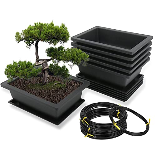 MissFox Bonsai skål med underlägg, 6 stycken bonsai träningskrukor av plast, krukväxter blomkruka för trädgård, blomkruka rektangulär set med 1,5/2/3 mm aluminium bonsaitråd, 16 x 12 x 6 cm