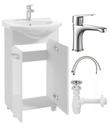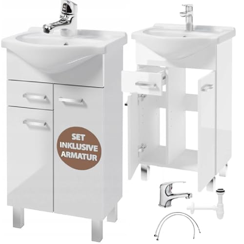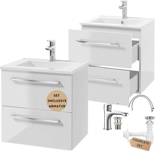 .Deftrans tvättställsunderskåp 50 cm hängande med tvättställ, armatur och vattenflaska, tvättställ med underskåp, softclose, badrumsmöbler set för små badrum, högglansigt vitt