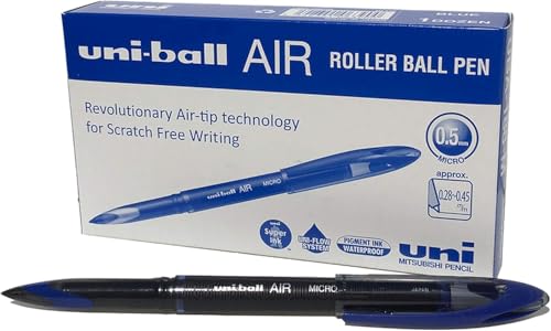 uni-ball UB-188-M Micro Air Rollerball-pennor. Premium 0,5 mm spets för supersmidig handstil. Skriver som en reservoarpenna. Bleknings- och vattenbeständigt flytande Uni Super Ink. Låda med 12 blå