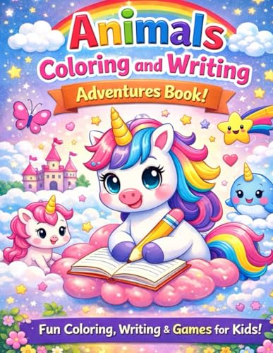 Animals Unicorn Coloring and Writing Adventures Book!: Fun Coloring, Writing & Games for Kids Ages 3–6