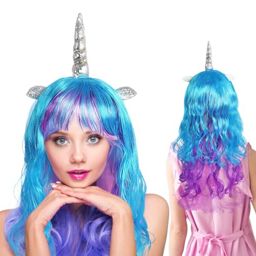 Regnbågsperuk, enhörningsperuk, 60 cm peruk enhörning vuxna barn, lång lockig hårperuk, regnbågsdräkt accessoarer, enhörningspuk, för karnevaler, halloween, kostym