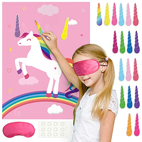 FEPITO Enhörningsfestspel för barn, fäst hornet på enhörningen, födelsedagsfest, spel, affisch med 24 horn, fäst svansen på enhörningen för enhörning, festvägg, hem, rum, dekorationer, tillbehör
