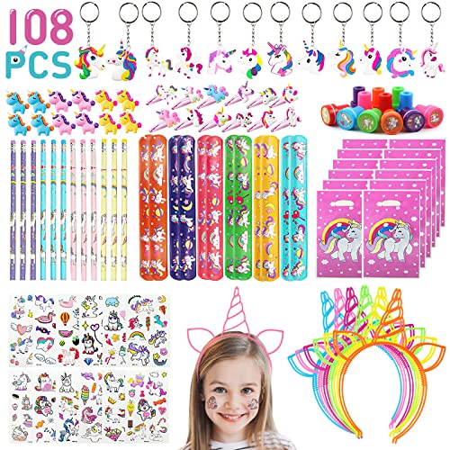 108 Piece Enhörning Party Stroke Barns Födelsedagsflicka, Enhörning Presenter för flickor Födelsedagsdekoration med nyckelring Enhörning Hårklipp Stämpeltatuering för Enhörning Stroke Girl