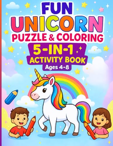 Fun Unicorn Puzzle & Coloring 5-in-1 Activity Book (Ages 4-8): Unicorn Coloring, Mazes, Dot-to-Dot, Word Search & Crossword - Single-Sided Magical Fun Pages for Early Learners