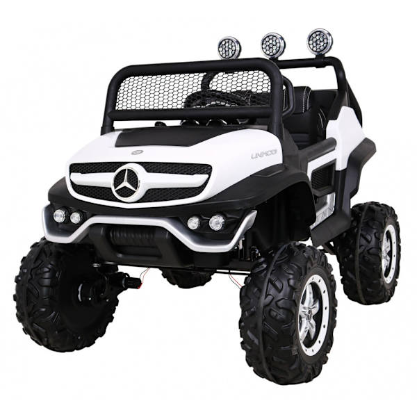 Mercedes Benz Unimog för barn Vit + fyrhjulsdrift + fjärrkontroll + bagageutrymme + långsam start + MP3 LED