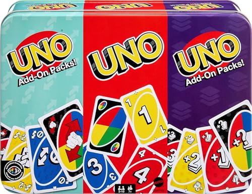 Mattel Games UNO Kortspel med 2 expansionspaket och en samlingsbar metalllåda för barn, vuxna och familjespelkvällar för 2–10 spelare, JCV60