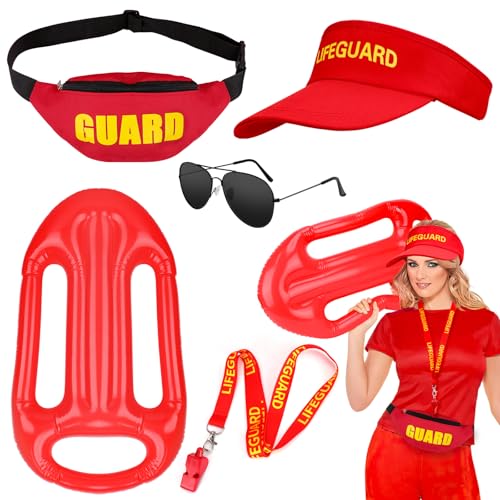 SelfTek 5 st livräddare kostymtillbehör, röd livräddare hatt skydd visselpipa midjeväska svarta solglasögon uppblåsbar flytande rekvisita livräddare kostym fin klänning för kvinnor män strand pool