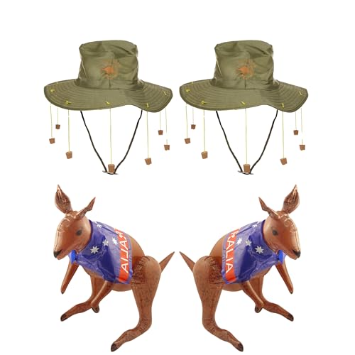 Lizzy 2 x vuxen australisk korkhatt & 2 x uppblåsbar känguru med australisk flagga (70 cm) för Australiens dag krokodil jägare man fin stil klänning hatt