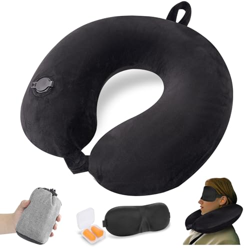 Cirorld Nackkudde flygplan uppblåsbara, resekuddar flygplan nackkudde, nackhörn vuxna, uppblåsbar resekudde med ögonmask och öronproppar (svart)