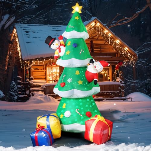 240 cm uppblåsbar juldekoration för utomhusbruk med roterande LED-belysning, XXL, uppblåsbar julgran med jultomte, snögubbe och 3 presentlådor för trädgård, terrass, gräsmatta