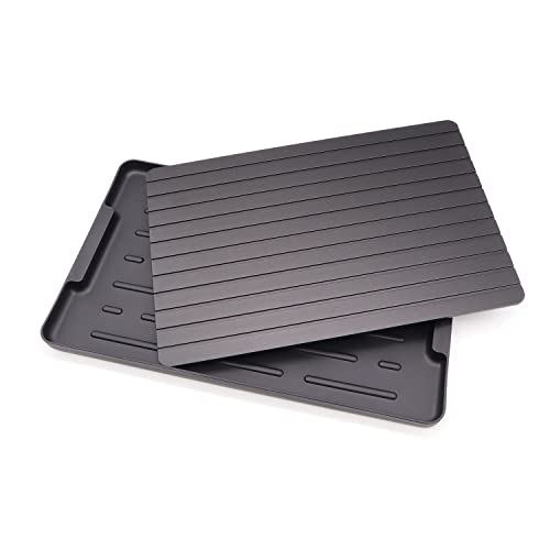Avfrostningsbricka, snabb upptining av fryst mat, snabb kötthaw tallrik med droppbricka, avfrostningsmatta av aluminiummetall, ingen mikrovågsugn eller elkraft krävs, svart