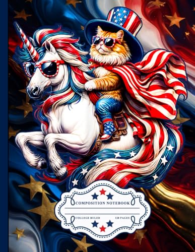 Composition Notebook: Funny Patriotic Cat Riding Unicorn with USA Flag, 4th of July Themed Journal for Students, School, College, Teachers, and Office Workers