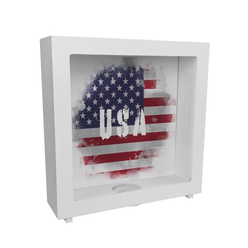 Sparbössa med ram av trä, USA-flagga i använt utseende – spargris för semesterfirare, en vacker sparbössa dekorerad med USA:s nationalflagga för att spara på resan